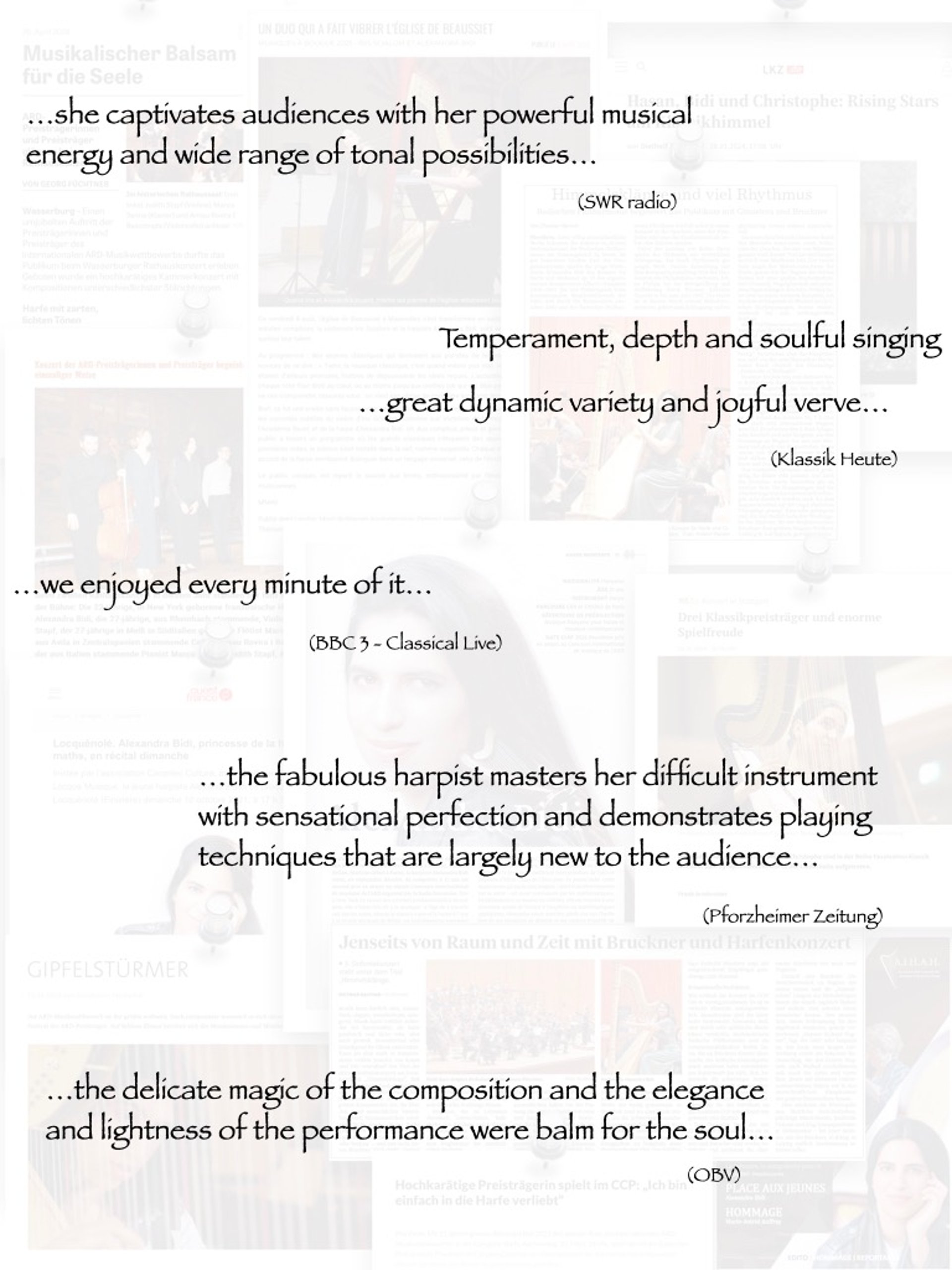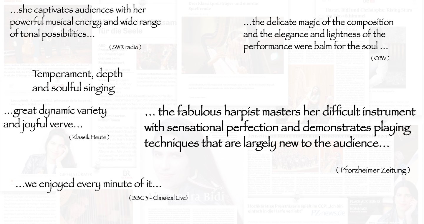 Acclamée par le Stuttgarter Zeitung pour son "immense joie de jeu" et sa "mâitrise technique" et par la radio allemande SWR pour sa "puissante énergie musicale et la richesse de sa palette sonore" Alexandra Bidi est une artiste d'une profondeur et d'une polyvalence musicales remarquables.