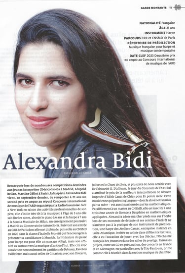 ...la fabuleuse harpiste Alexandra Bidi [...] maîtrise son difficile instrument [...] avec une perfection sensationnelle et démontre des techniques de jeu qui sont en grande partie nouvelles pour nombreux visiteurs de la très bien remplie salle de concert de CCP.