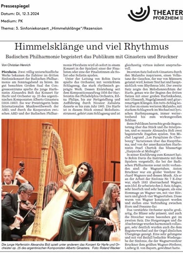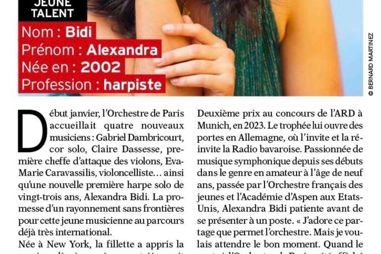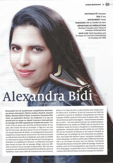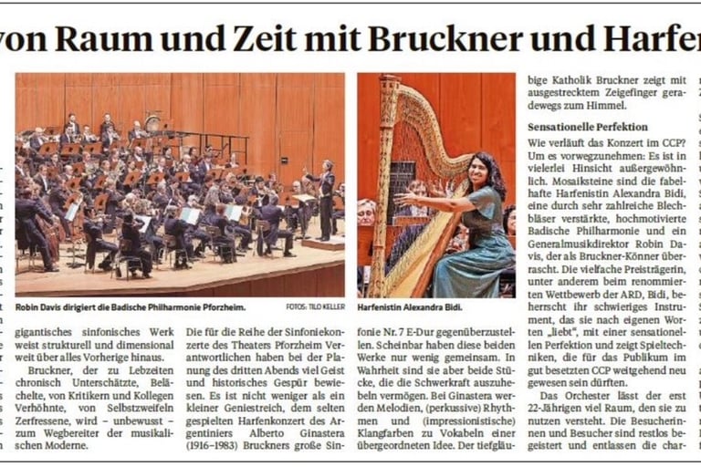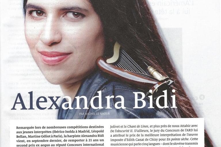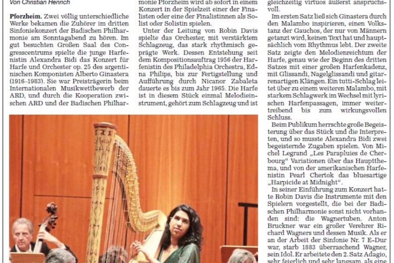 Alexandra Bidi [...] enlivened the Handel concerto with plenty of legato, purposeful runs, echo effects, great dynamic variety and joyful verve. In the Larghetto, her breathing phrasing and emphasis (or changes?) of secondary voices were convincing. In the Fantasia, she acted like a magical harp, full-toned and graceful at the same time, slightly mysterious with enticing bell tones, always in dialog with the violin, whose themes she took up and adapted for the harp: both inspire each other. She also gained something magical from the commissioned composition, producing glassy piano sounds in the treble and creating powerful string buzzing with a strong metal pin. Above all, however, she creates the impression of unity despite the disparate parts of the piece and thus makes a great impression.